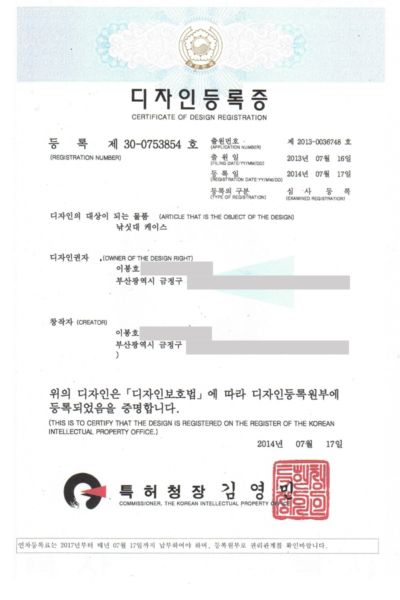 디자인등록증 페이지 정보 작성자관리자 댓글 0건 조회 4,810회 작성일 18-12-18 17:20 본문 디자인등록증 목록 이전글디자인등록증 18.12.18 다음글상표등록증 18.12.18 댓글목록 댓글목록 등록된 댓글이 없습니다.